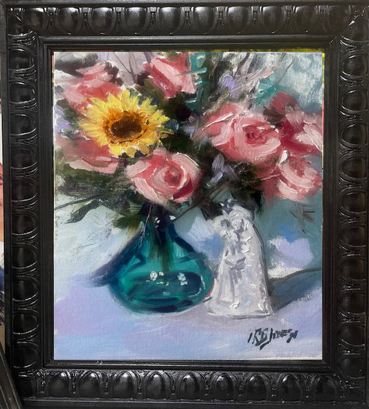 Studio Sunflower with Roses Study — Oil on Board, 9 x 12 inches By Richard Burke Jones - One Week Only